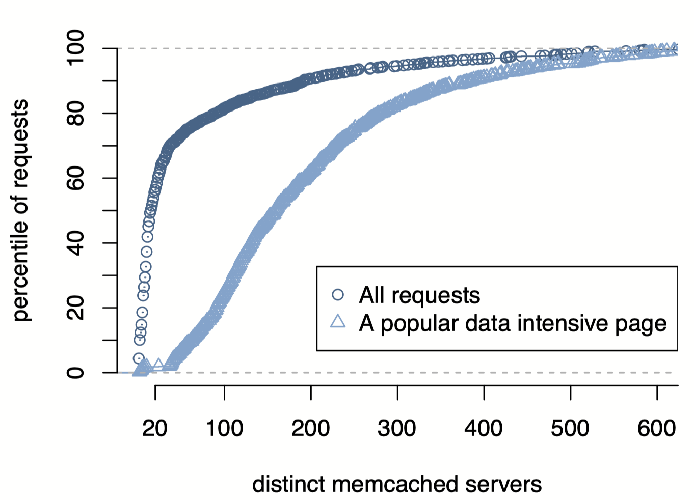 如图所示,56%的页面请求访问了不到20个memcached服务器。就数量而言,用户请求倾向于请求少量的缓存数据。然而,这种分布有一个长尾效应。该图还描述了一个更流行的页面的分布,该页面更好地展示了all-to-all通信模式。这种类型的大多数请求将访问超过100个不同的服务器;访问几百个memcached服务器并不罕见。