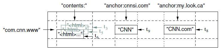 每个锚链接只有一个版本 ;而 contents 列则有三个版本,分别由时间戳 t3,t5和 t6 标识。