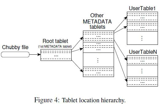第一层是一个存储在 Chubby 中的文件,它包含了 Root Tablet 的位置信息。Root Tablet 包含了一个特殊 的 METADATA 表里所有的 Tablet 的位置信息。METADATA 表的每个 Tablet 包含了一个用户 Tablet 的集合。