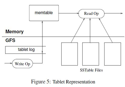 Bigtable 采用 memtable 和 SSTable 存储对表的更新的方法与 Log-Structured Merge Tree存储索引数 据更新的方法类似。这两个系统中,排序的数据在写入到磁盘前都先存放在内存中,读取操作必须从内存和 磁盘中合并数据产生最终的结果集。