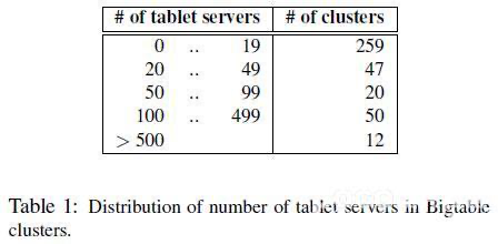 这个服务系统使用一个表来索引 GFS 中的数据。这个表相对较小(大约是 500GB),但是这个表必须在 保证较低的响应延时的前提下,针对每个数据中心,每秒处理几万个查询请求。 因此,这个表必须在上百个 Tablet 服务器上存储数据,并且使用 in-memory 的列族。