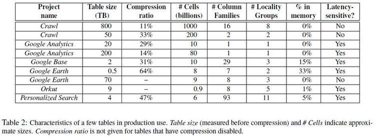 表 2 提供了一些目前正在使用的表的相关数据。一些表存储的是用户相关的数据,另外一些存储的则是 用于批处理的数据;这些表在总的大小、 每个数据项的平均大小、从内存中读取的数据的比例、表的 Schema 的复杂程度上都有很大的差别。本节的其余部分,我们将主要描述三个产品研发团队如何使用 Bigtable 的。