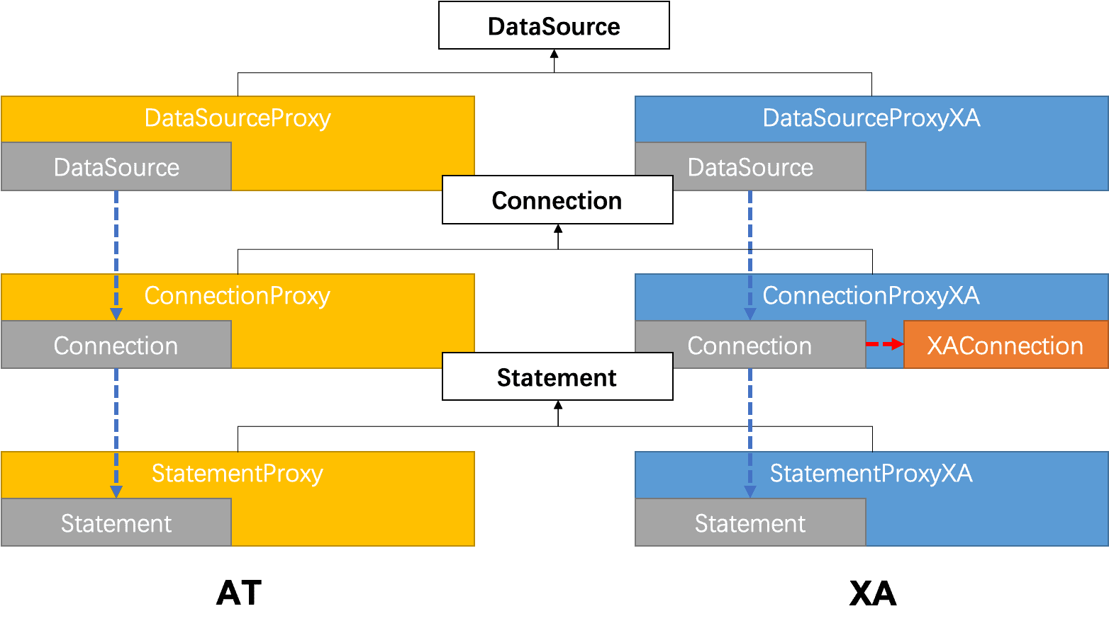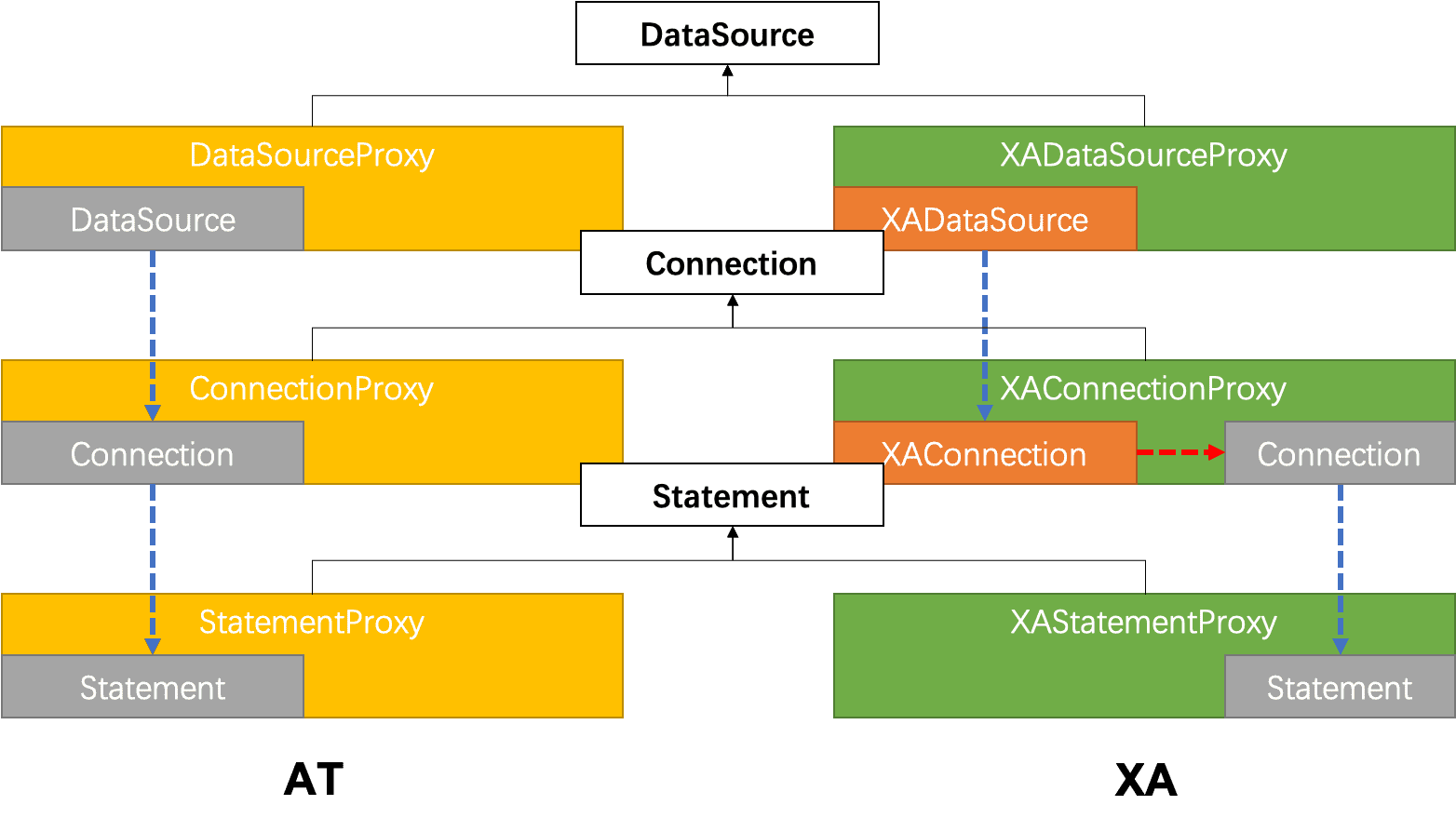 综合考虑,XA 模式的数据源代理设计需要同时支持第一种方式:基于 XA 数据源进行代理。
