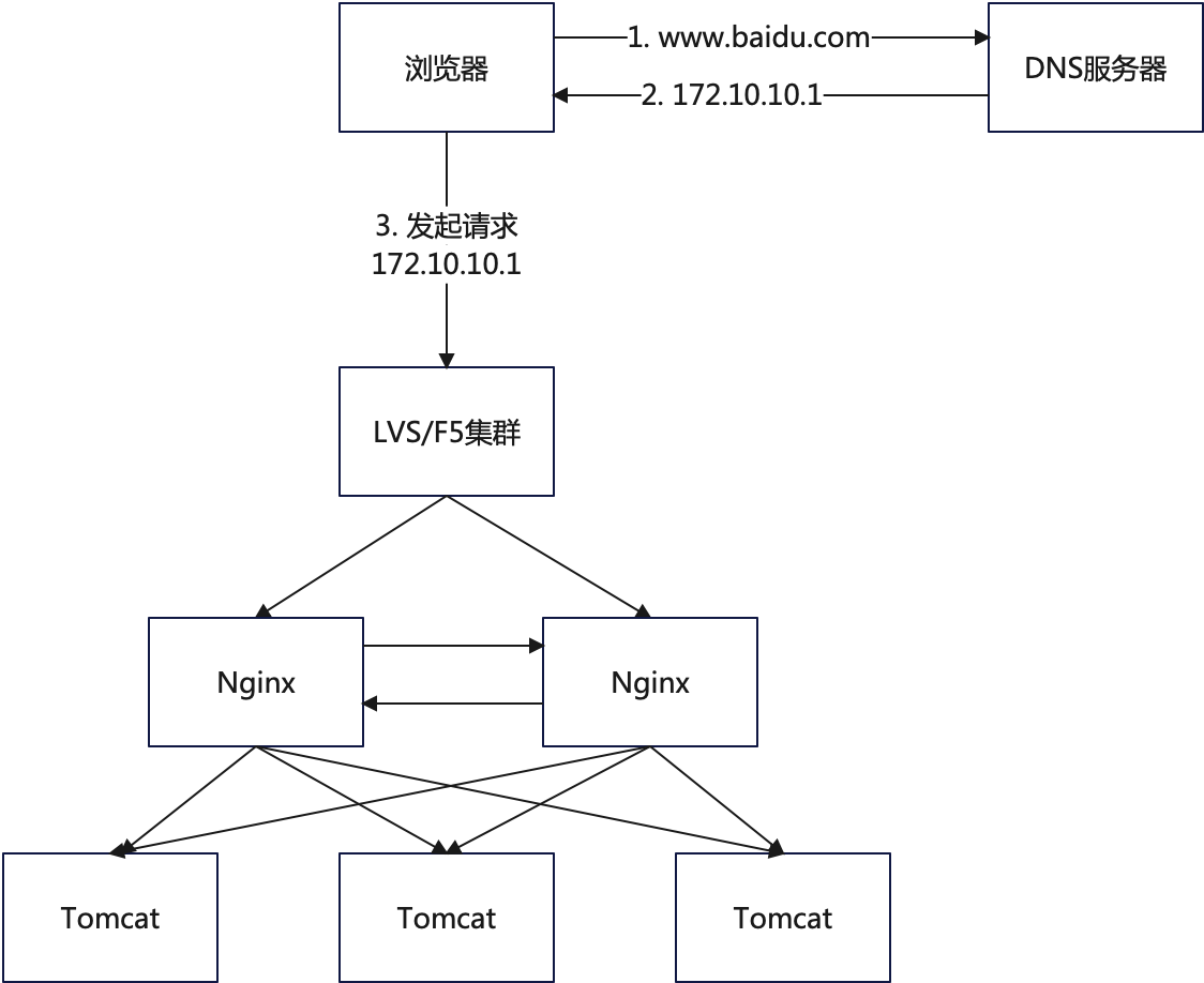 在用户访问某一个网站的时候,首先是通过 DNS 解析,将域名换成 IP,所以在第一步可以通过 DNS 解析的方式,进行第一次负载。