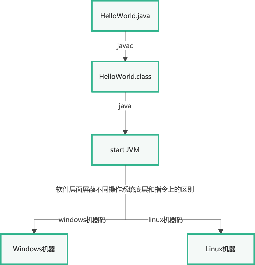 通过c++语言的特性,编译成不同平台的二进制代码,实现Java语言的跨平台,如下图所示: