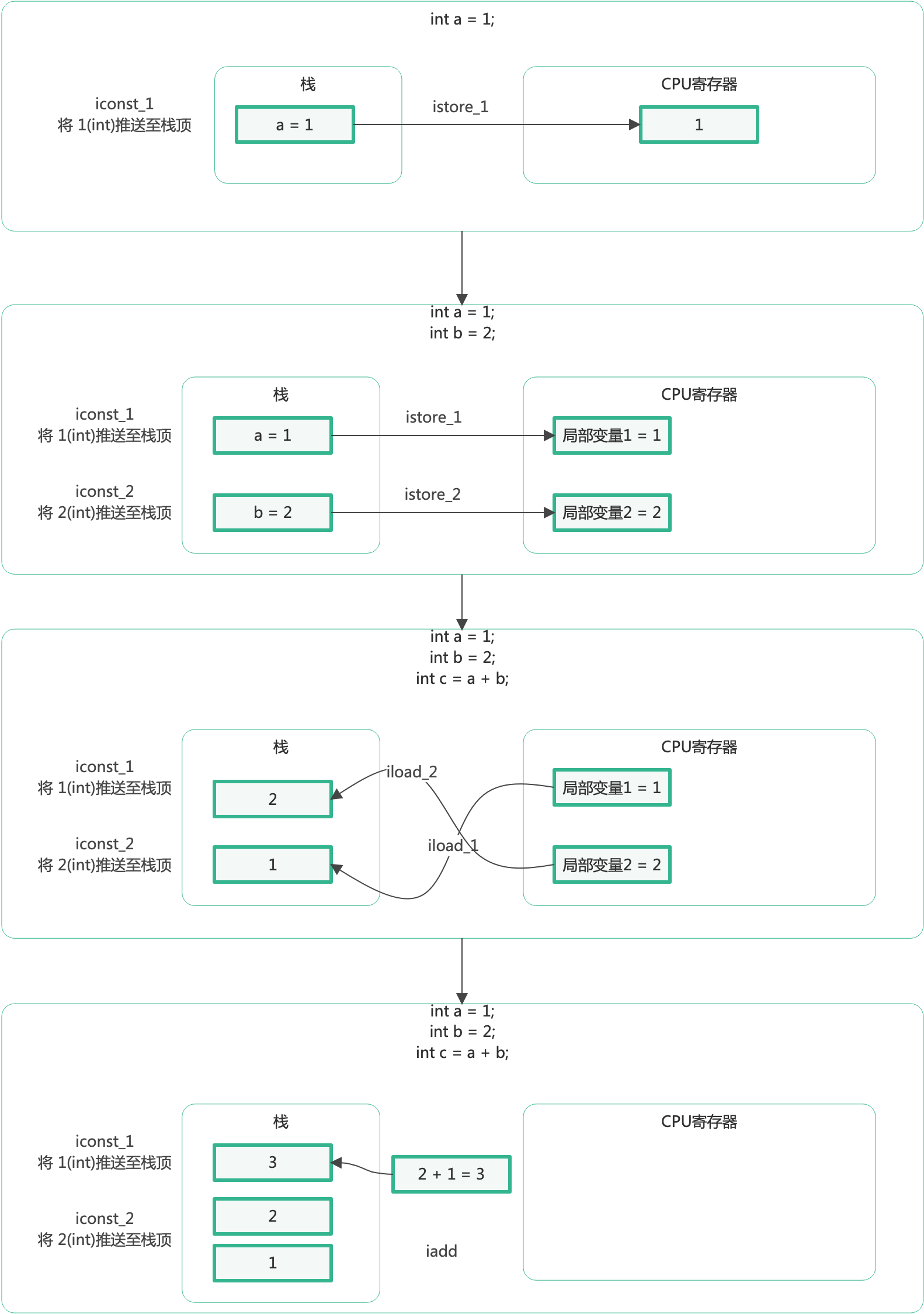 java编译之后,将会是一个个虚拟机的指令集,对应着压栈和出栈的逻辑, 上面套逻辑对应着压栈出栈的过程如下: