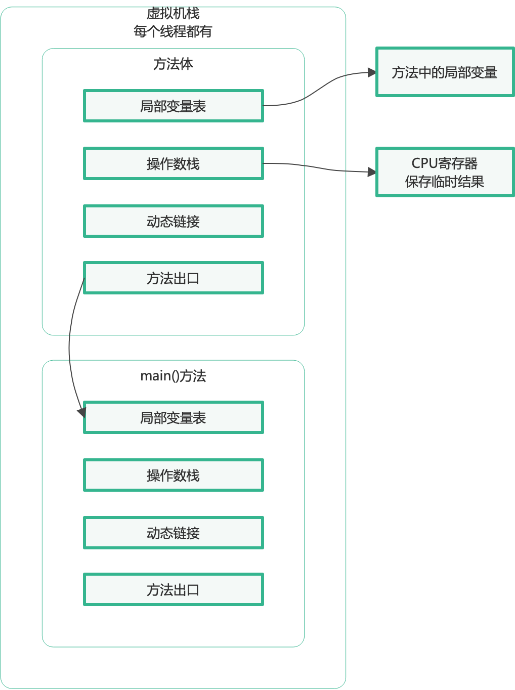 因为需要不断的压栈,出栈。。再加之要考虑多线程的上下文切换的问题,为了更加好的管理这部分东西,JVM虚拟机规范又将虚拟机栈中每个方法快都抽象成一个小栈帧,再将栈帧继续划分4个小块,结构如下: