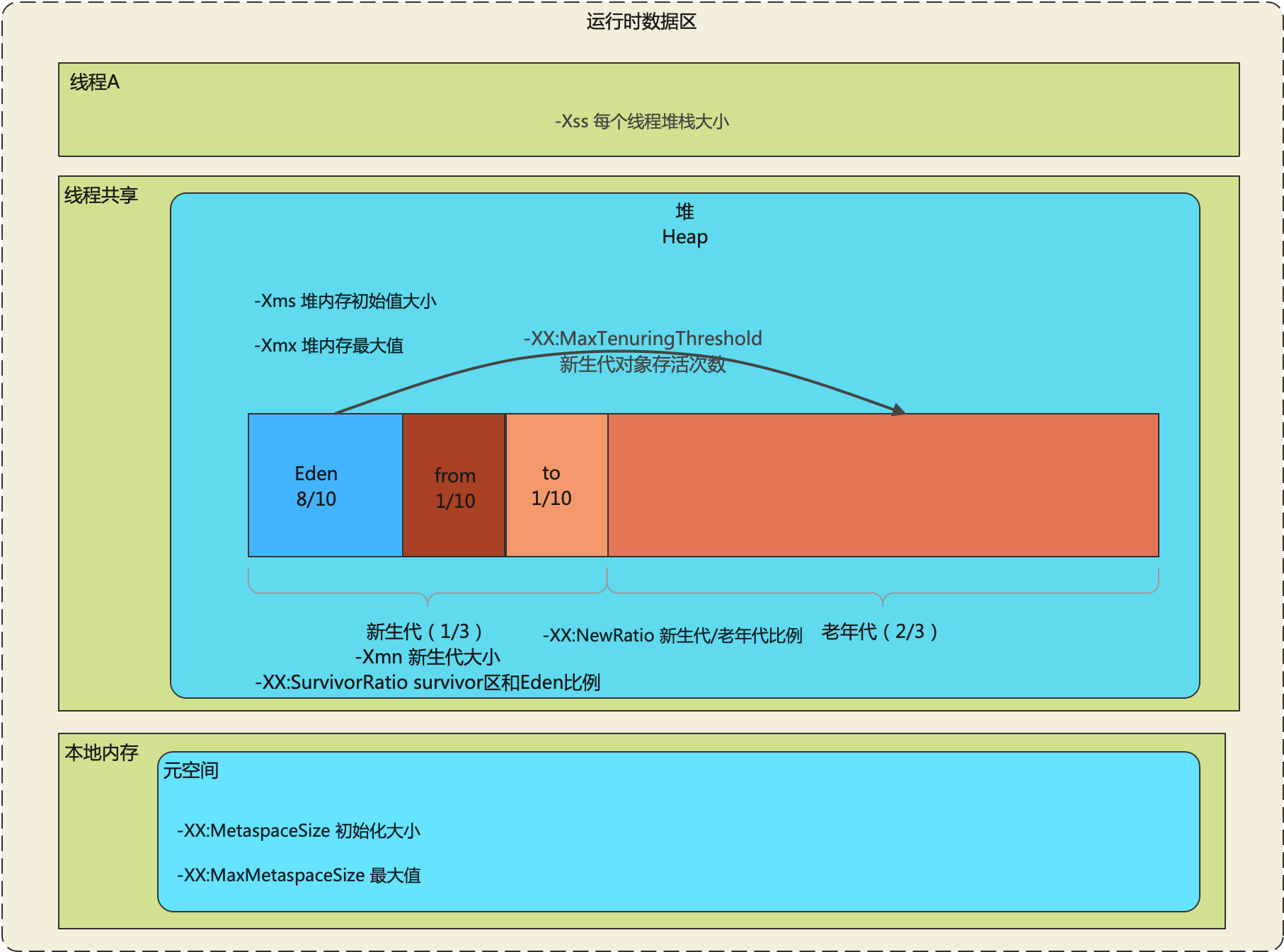 | -XX:SurvivorRatio | Eden区与Survivor区的大小比值 | 设置为8,则两个Survivor区与一个Eden区的比值为2:8,一个Survivor区占整个年轻代的1/10 | |