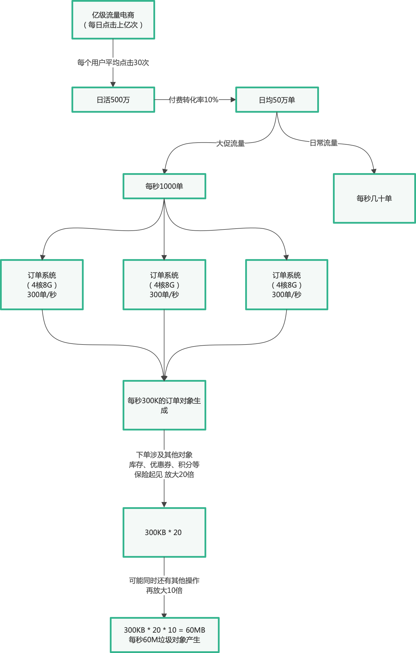 - 一个 4 核 8G 的订单系统,假设给 JVM 运行内存为 3 个G,根据堆内存划分比例老年代可分 2G,Eden 800M,S0/S1 各 100M。