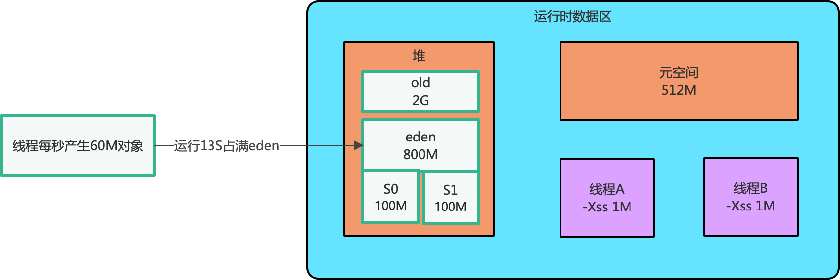 - 线程运行每秒产生 60M 对象,大概运行 13 秒就会占满 Eden 区,前 12 秒产生的对象在做一个 minor gc 后被当作垃圾对象处理掉,第 13 秒产生的对象不是垃圾对象,会被放到 S0 区。