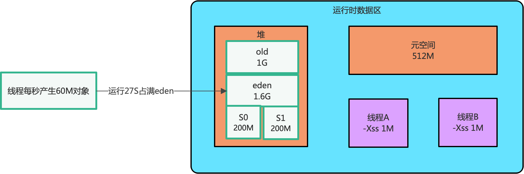 - 线程运行每秒产生 60M 对象,大概运行 28 秒就会占满 Eden 区